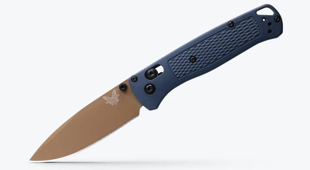 • BENCHMADE BUGOUT, AXIS, DROP POINT CRATER BLU GRIVORY HANDLE