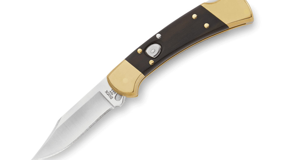 • BUCK KNIVES 112 RANGER AUTO LOCK-BACK KNIFE, BRASS BOLSTERS, EBONY HANDLES, 3″ 420HC BLADE WITH LEATHER SHEATH