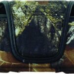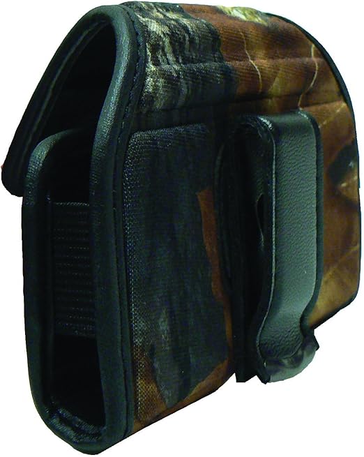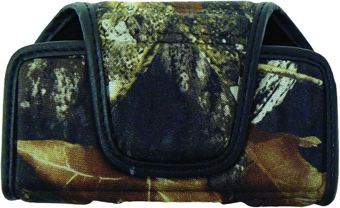 A padded, Mossy Oak camouflage cell phone holster featuring a quiet magnetic closure and a $360^circ$ rotating belt clip for secure, discreet carrying during outdoor activities.