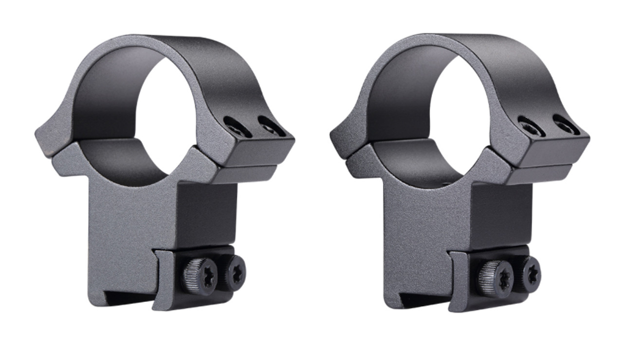 This is a pair of Optisan Champion, High profile scope rings. They are a fixed, two-piece design that fits 30MM scopes and mounts onto standard 11mm Dovetail rails (common on air rifles and rimfire guns). The rings are finished in Matte Black.