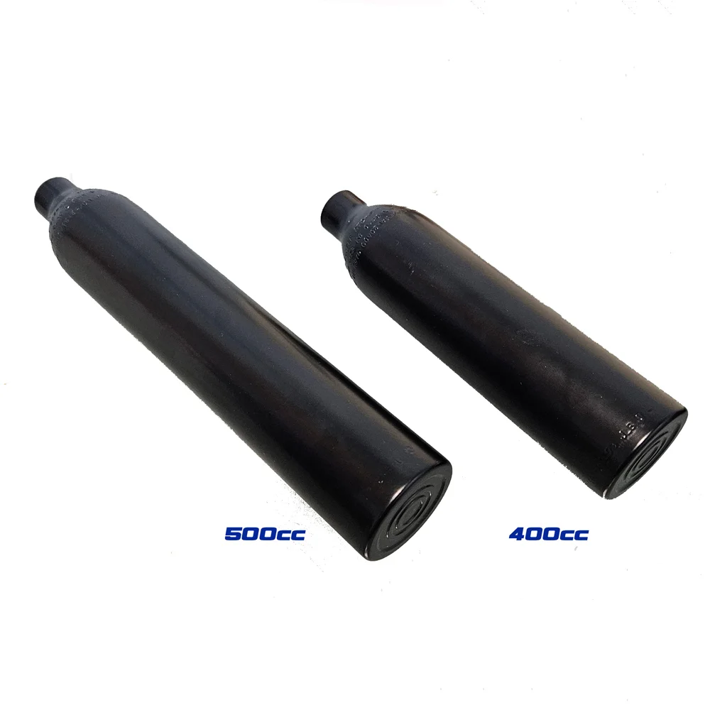 The 400cc buddy bottle, and also the longer 500cc version, are each constructed in alloy. The finish is gloss black anodizing. Luxfer manufacture these bottles in the UK.