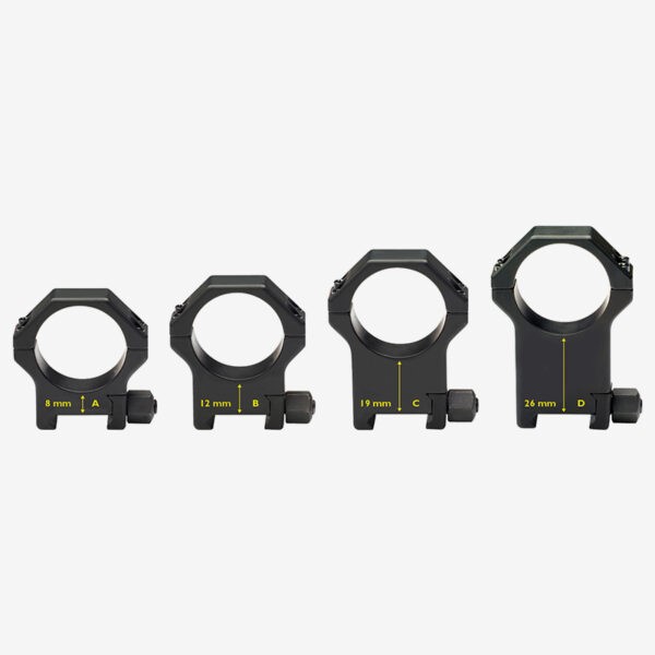 Pair of hardened steel rings for picatinny or weaver rails. Designed to ensure durability, stability and to guarantee the return to zero. Rings can be fitted with 5mm stop recoil for Picatinny rails or 4mm stop recoil for Weaver rails.
