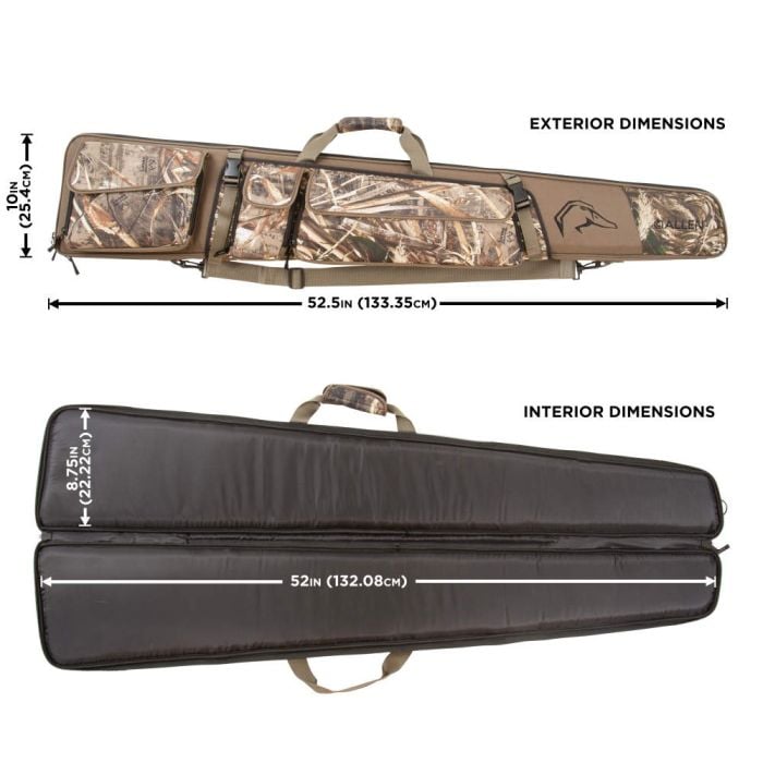 The main front pocket has a weatherproof storage pocket, four large elastic loops, and a stretch-fit pocket for storing larger items. The center pocket was designed to hold field gear, such as your rangefinder and compass. The rear pocket is designed to hold 4 calls and your lanyard. This case also features the innovative Gear Fit™ quick-connect straps, which allow you to bring large items, like your jacket or dog vest. The inside of the case has heavy-duty, dual-density foam for ultimate protection. The lining is easy to clean, and the oversized zippers make it easy to open and close. includes a detachable, adjustable shoulder strap. The Gear Fit Pursuit™ Punisher Shotgun Case is highly water-resistant and can float for a limited time with a firearm and appropriate amount of gear stored properly in the case. This case is not to be used as a flotation device please exercise caution and safety when hunting near water.