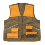 A durable upland hunting vest with blaze-orange trim designed to carry shotgun shells and hunting gear while providing high visibility and comfort during bird hunting.