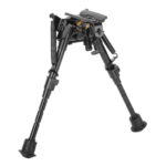 The lightweight aluminum design adds minimal weight and deploys quickly, with legs that instantly spring out to the shooting position with the touch of a button. The legs are notched for easy indexing to a specific height. There is a connection point for sling attachment and multi section legs that collapse forward allowing for convenient carry of the firearm. Soft rubber feet provide enhanced stability, while the padded bipod base protects the firearm’s forend. Available in 4 heights, black or camo and both standard and pivoting models.