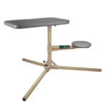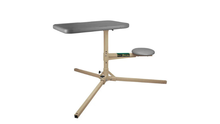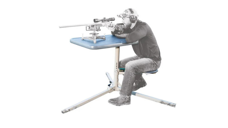 The central shaft, seat, and tabletop pivot around a center axis as a single unit while keeping the tabletop parallel to the horizon. This allows the user to make shots at any angle from a single setup – ideal for varmint hunting. The bench can easily be locked into a single shooting position if desired. The top is made from molded plastic with a rigid metal under-frame. The top includes holes that function as handles for easy transport or as holders for the included cleaning forks. The seat adjusts from 16” to 22” and rotates in tandem with the tabletop. Convenient cleaning forks are included that snap into position in the top and securely hold a gun for cleaning. The shooting bench breaks down into seven pieces and weighs a total of 60 pounds when assembled.