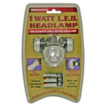 The Brinkmann 1 Watt LED Headlight (809-1037-0) is a compact, battery-powered hands-free lighting device featuring a 1 W LED that produces approximately 50 lumens of white light, mounted on an adjustable head strap for outdoor use.