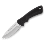 The ergonomic handle is constructed out of Dynaflex® rubber for superior grip, performance, and light weight. There is a lanyard hole on the handle for different attachment options. The drop point blade has been tumbled finished, for a less porous, improved corrosion resistance. There is jimping on the spine for added control when doing detailed work. This knife features full tang construction for added strength and reliability. Includes a heavy-duty, black polyester sheath. Overall length: 7 1/2″ (19.1 cm). Imported Sheath.