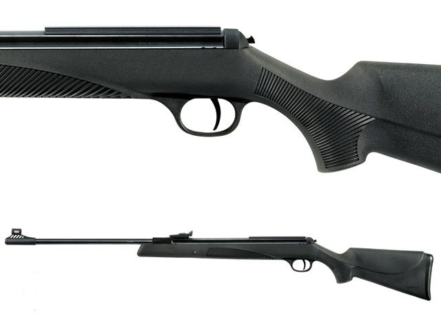 It features a length of 116 cm, a 49.5 cm steel barrel, and weighs 3.4 kg, with a muzzle velocity of about 225 m/s in 5.5mm. The synthetic stock provides an ergonomic grip, and it includes fiber optic sights, an adjustable match trigger, and an automatic safety.