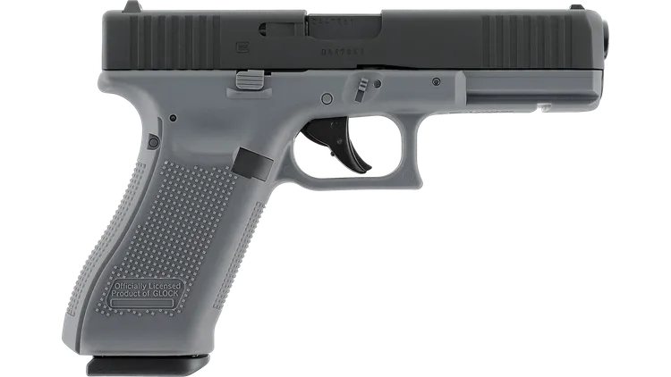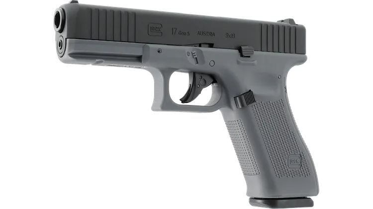In plinking the CO₂-operated airgun version of the GLOCK 17 Gen5 is notable for its similarity to the original. The Gen5-typical features include front serrations, a Weaver rail and a trigger safety. The heavy metal slide and powerful blowback provide an authentic shooting experience. Every shot fired from the 18-round all-in-one magazine produces a convincing recoil. The precise dimensions and realistic weight ensure perfect handling and full compatibility with standard accessories like holsters. There is also an additional sliding safety.