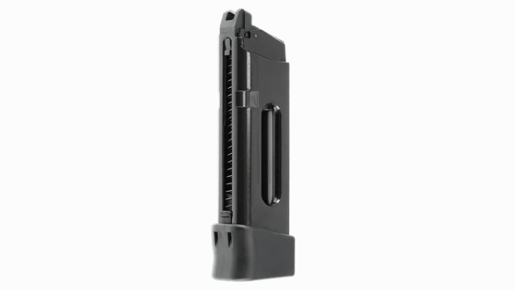 The magazine houses a single 12g CO2 cartridge, which is easily installed via a bottom-loading compartment. Its slim-line design mimics the dimensions of the real-steel G19 magazine, allowing it to fit into standard duty pouches. With a spring-fed 11-round capacity, it ensures consistent feeding and reliable performance, even in rapid-fire scenarios.