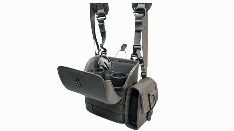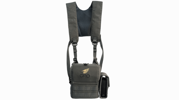 Der GPO Harness PRO ist auf Ferngläser mit den Maßen H: 170 mm / B: 170 mm / T: 85 mm zugeschnitten und bietet einen passgenauen Sitz für Ihre Optiken. Zu seinem innovativen Design gehört eine abnehmbare Seitentasche, in der Sie einen Pocket-Entfernungsmesser wie unseren RANGETRACKER 2000, ein Smartphone oder anderes Zubehör unterbringen können, das Sie unterwegs benötigen.