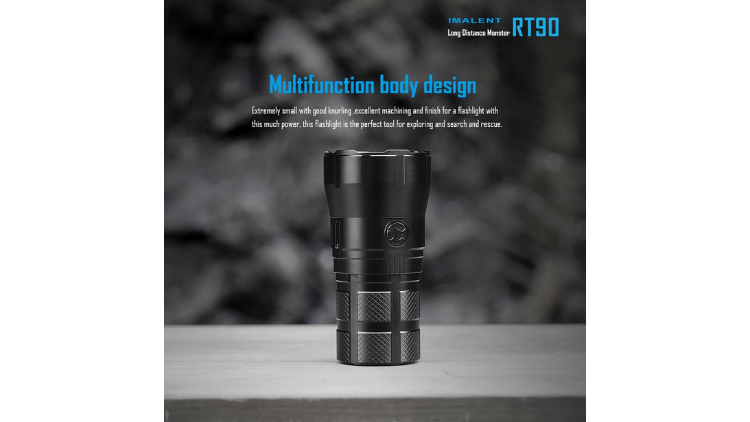 The IMALENT RT90 is a compact yet extremely powerful long-range flashlight built for professional search, rescue, and outdoor use. It utilizes a LUMINUS SBT-90.2 LED emitter capable of generating 4,800 lumens of brightness while focusing the beam to reach distances of up to 1308 meters.