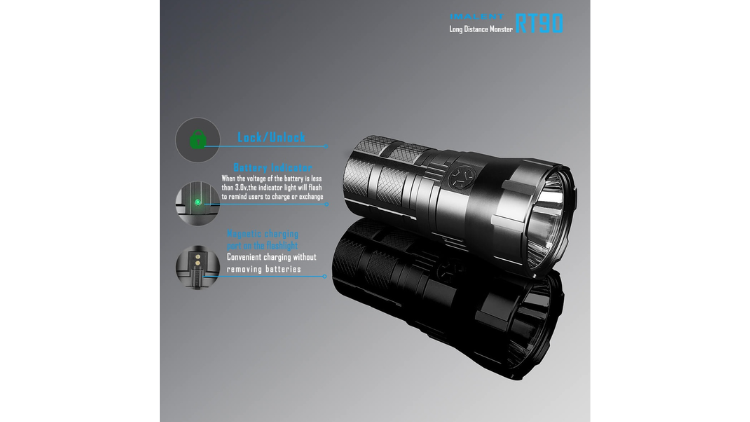 The IMALENT RT90 is a high-intensity search flashlight producing up to 4,800 lumens and a maximum beam distance of 1308 meters, powered by four rechargeable batteries and designed for long-distance illumination and outdoor operations.