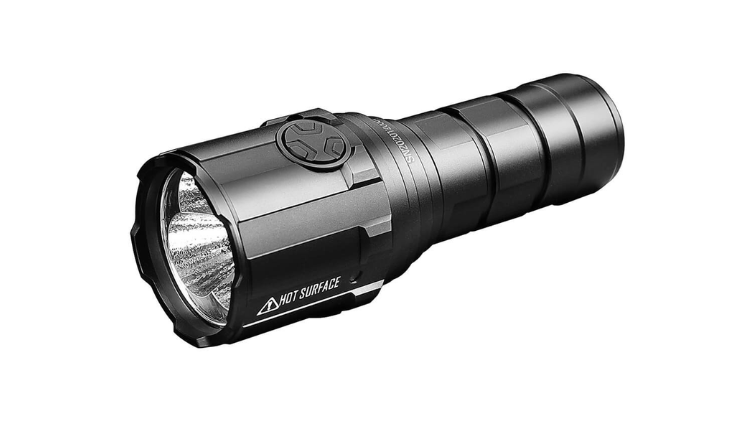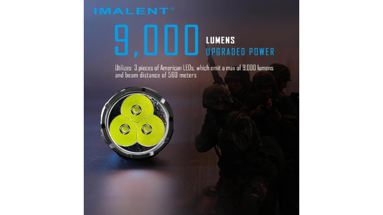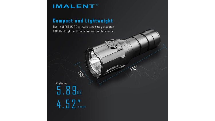 The IMALENT R30C is a compact yet extremely powerful flashlight designed to deliver high-intensity illumination in a portable form factor. It uses three high-performance LEDs capable of producing a maximum output of 9,000 lumens, providing bright flood illumination while maintaining a long throw beam reaching 560 meters.