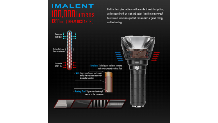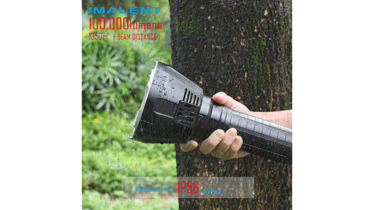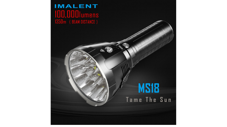 The IMALENT MS18 is an ultra-high-performance rechargeable search flashlight capable of producing up to 100,000 lumens with a maximum beam distance of 1350 meters. It uses 18 CREE XHP70.2 LEDs, a high-capacity rechargeable battery pack, and an advanced cooling system to maintain stable brightness during high-power operation.