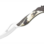 Classic-style sporting folding knife from the JKR series featuring a 9 cm stainless steel blade and an artistic Zamak handle with a bear-themed engraving.