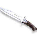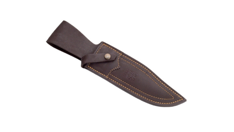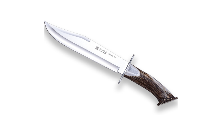 The Joker Bowie 25 hunting knife is made of tang blade made of Mova 1.4116 stainless steel with a blade length of 25 cm, blade width of 5 cm and a thickness of 5 mm. The handle length is 16 cm and is made of hand carved deer antler. The Joker Bowie 25 hunting knife is accompanied by a premium leather sheath in brown.