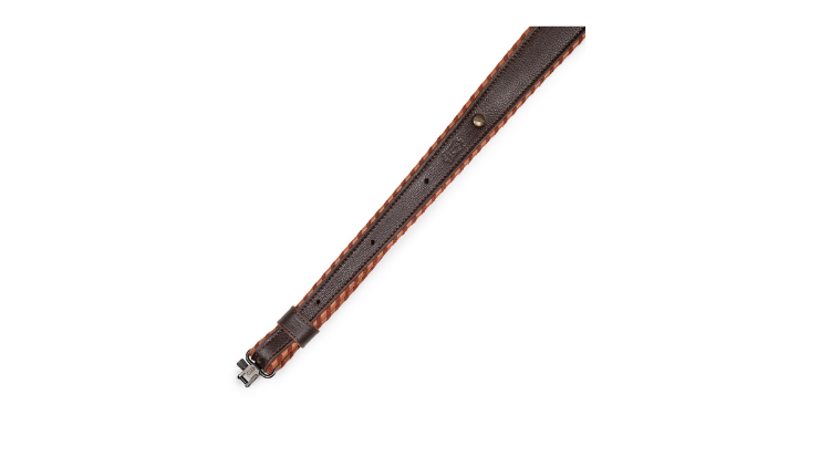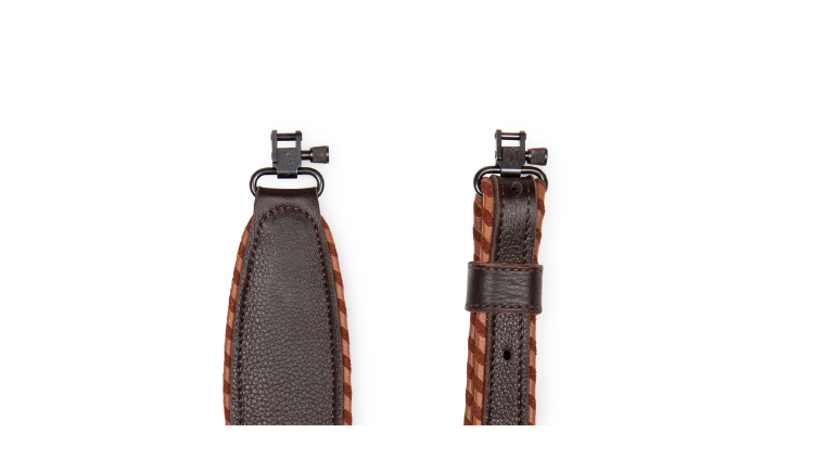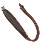 2 1/4″ soft garment leather cobra rifle sling with decorative suede-and-leather piping, foam padding, soft garment leather backing, loop adjustment, and attached swivels. Adjustable from 29″ to 37″. Available in black (BLK) or dark brown (DBR).