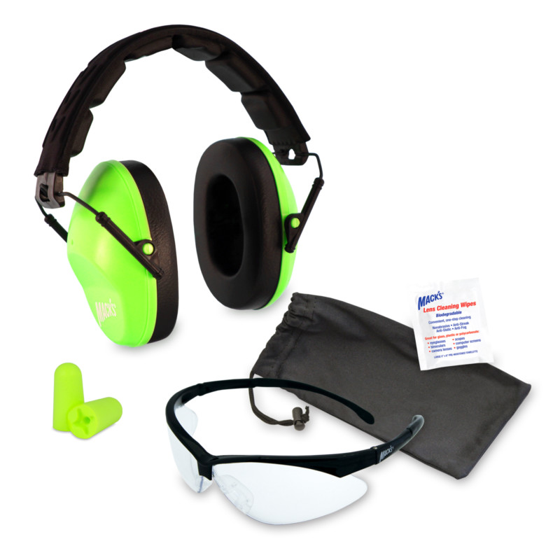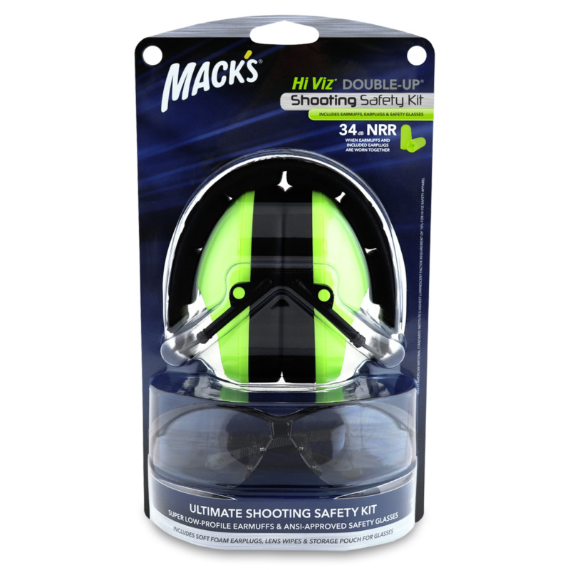 2. Fast acquisition for critical use: Mack’s Hi-Viz earmuffs give hunters and shooters the best chance to quickly visually locate for immediate use when under unexpected or sudden shooting situations. 3. Finding if dropped or lost: Superior luminescence makes Mack’s Hi-Viz earmuffs easier to locate. Utilizing the brightest color to the human eye gives hunters and shooters the best chance of finding earmuffs if lost.*Meets American National Standards Institute’s highest luminescent factor Requirement of 70% for Hi-Viz safety apparel According to ANSI, there are no alternative colors as luminous as fluorescent yellow-green. Mack’s Hi-Viz earmuffs are the most visible color available. Ultimate shooting safety kit (earmuffs + earplugs + glasses) Low Profile Earmuffs – ultra-lightweight; fully adjustable and foldable; fits kids to adults; super soft, padded ear cups and headband for maximum comfort Earplugs – 5 Pair Hi Viz* Soft Foam for all-day comfort; extreme noise blocker Safety Glasses – clear vision, zero distortion lenses protect against harmful UV rays – 99.9% UV protection; anti-fog, scratch-resistant lenses; wide lens for full coverage; meets ANSI Z87.1 Impact Standards for Impact Resistant Protection; comfort fit, lightweight frame with hinged stems and soft rubber nose pieces allows for all-day comfort Lens Wipes – 5 individually wrapped, pre-moistened wipes; anti-fog, anti-static, anti-streak