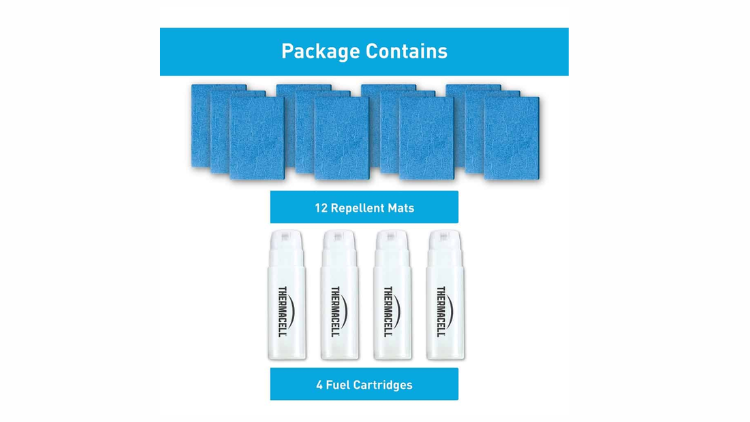 Package contains: 12 repellent mats and 4 fuel cartridges