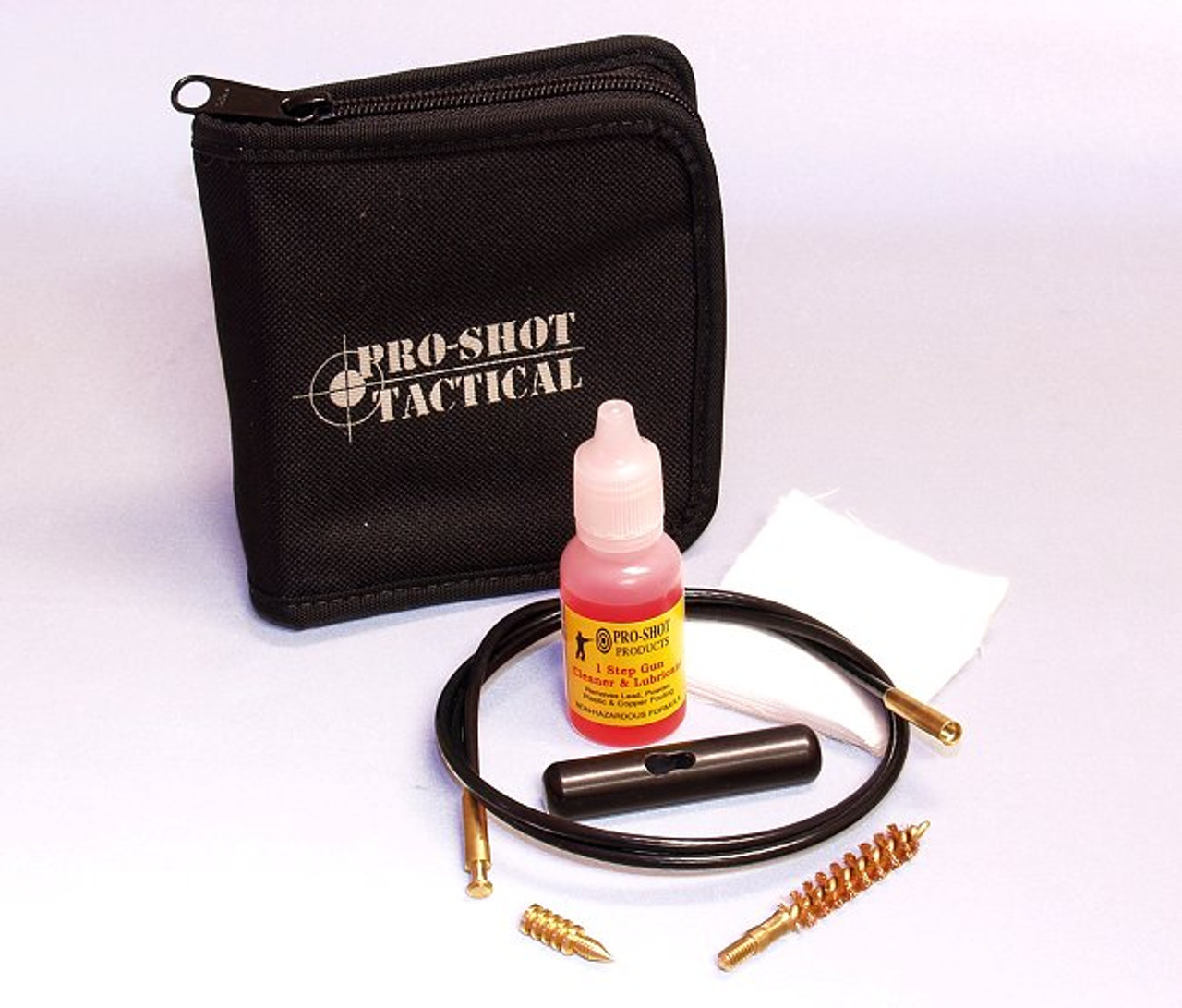 The Pro-Shot Tactical Gun Cleaning System is a pull-through cleaning system that uses a cable with separate jag and brush ends.