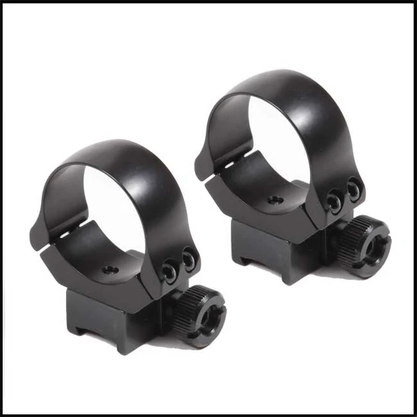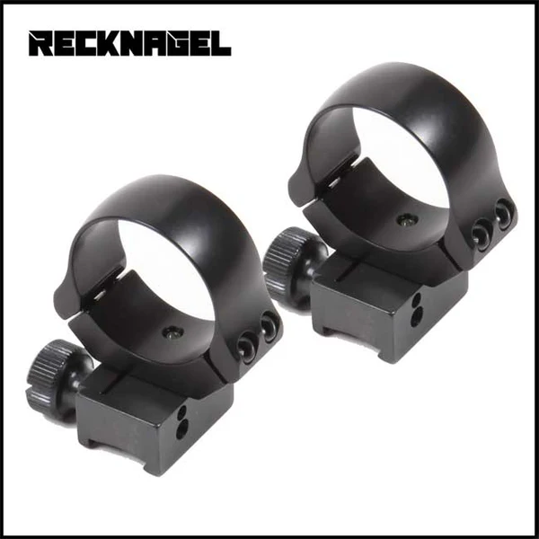 These 26mm ring mounts, precision made by Recknagel, are made to fit 11mm dovetail. They are slide off/tip off mounts with a BH of 17mm. There is also a removable recoil stud on one of the rings which can be easily unscrewed if not required.
