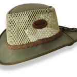 A rugged olive canvas outdoor hat with lightweight construction, broad curved brim, and ventilated mesh crown ideal for sun protection and breathable comfort during safari, hiking, gardening, or other outdoor adventures.