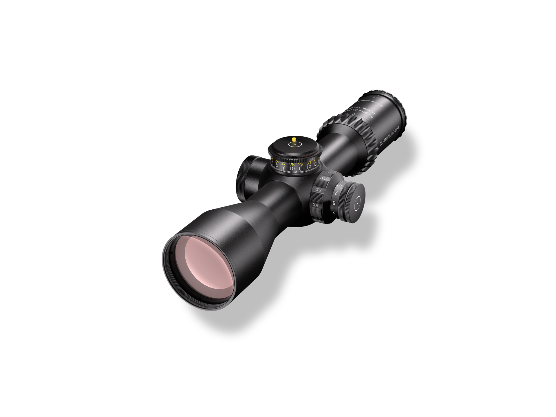 The 5-20×50 PM II Ultra Short is the world’s shortest, fully functional sniper riflescope Diopter adjustment (dpt) -3 to +2 | Exit pupil diameter (mm/in) 10.0-2.5/0.39-0.10 | Eye relief distance (mm/in) 90/3.54 | Field-of-view (m/100 m)/(ft/100 yd) 7.8-2.0/23.4-5.9 | Field-of-view (°) 4.5-1.1 | Illumination 11 | Length (mm/in) 299/11.77 | Magnification 5-20 | Main tube diameter 34 mm | Mounting System Ring mount | Objective diameter (mm/in) 50/1.97 | Turrets (Elevation/Windage) DT27 MTC LT / ST ZC CT (MRAD) | Adjustment range elevation (internal) 37.7 MRAD | Adjustment range elevation 27 MRAD | Adjustment range windage (internal) 31.9 MRAD | Adjustment range windage ±6 MRAD | Click value 0.1 MRAD | Twilight factor 15.8-31.6 | Weight (g) 870/30.69 | Illuminated reticle yes | Turret Rotation clockwise | Parallax adjustment yes | Made in Germany