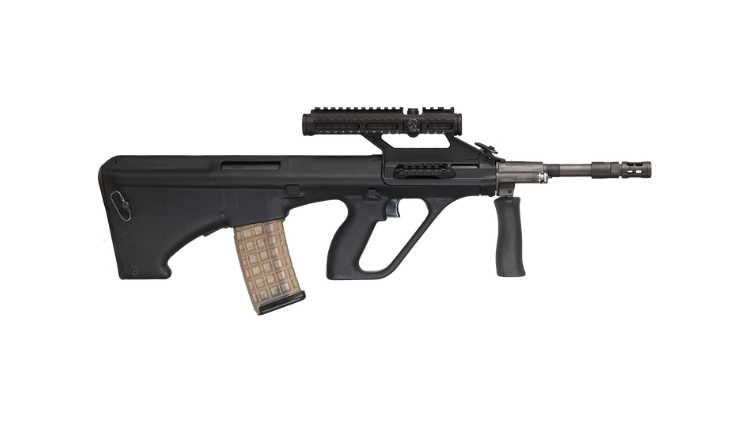 Chambered in .223 Remington / 5.56×45 mm, the rifle features a 417 mm cold hammer-forged barrel with chrome-lined bore and chamber for durability and accuracy. The AUG operates using a gas-operated system with a rotary bolt, ensuring reliable performance under various operating conditions.