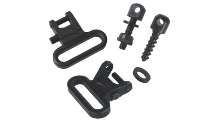 The Talon Swivel Screw (TAL-79410) is a sling swivel and hardware kit used to add 1-inch Talon sling swivels to a firearm. It includes swivels plus both machine screw and wood screw bases with spacers for easy installation on a variety of rifle stocks.