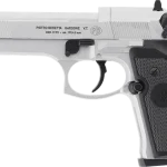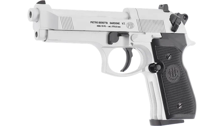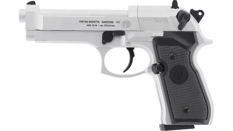 For these reasons it has a permanent place in the Umarex product range and has always been manufactured at our headquarters in Germany, where it was developed.In order to do justice to the famous original, this CO₂ version puts the emphasis on precise, reliable action. The Beretta MOD. 92 FS therefore has a two-part slide and an 8-round rotary magazine that is inserted right in front of the barrel. This ensures that pellets are fed precise into the rifled barrel. The 12-g CO₂ cartridge is housed in the full-metal frame for easy access. Each cartridge can fire as many as 60 rounds at an energy of up to four joules for continuous, powerful operation. A rifled barrel and adjustable sight ensure good accuracy. With its choice of single or double action and authentic safety lever, the Beretta MOD. 92 FS leaves nothing to be desired. Appearance has not been neglected. The Beretta MOD. 92 FS is available in plain black and nickel-plated models with additional wooden grip plates.