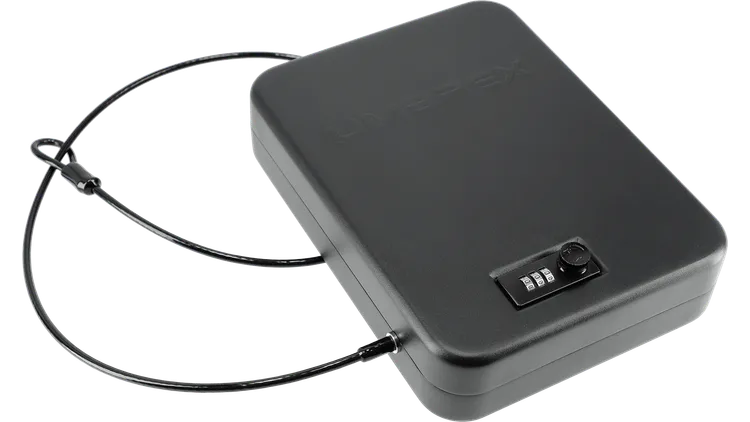 With the 1,3 mm thick steel housing, is provides a big resistance against any tampering. The dimensions allow the storage of bigger handguns like the HDR 50 or a Smith & Wesson 629 with 6.5” barrel. The Handgun Safe comes with a detachable solid steel cable which allows to secure the safe on fix objects like radiator pipes or similar. The padding with dense foam prevents scratches on the stored items.it locks via a combination lock. The Handgun Safe L is certified for handgun storage by the Californian Department of Justice.