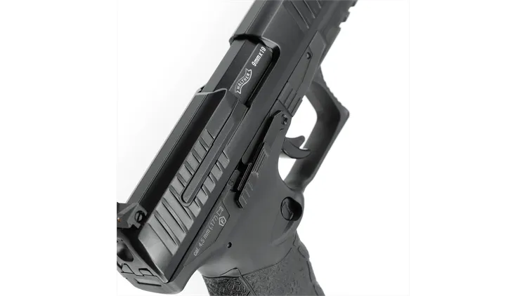 Realistic recoil is combined with maximum precision.Unlike many other models, the PPQ M2 feeds the 4.5 mm pellets from its magazine by means of a chain. Besides accommodating a 12 g CO₂ cartridge, the magazine has space for 21 rounds. The slide jumps back with every shot, producing a strong recoil. A rifled barrel in combination with the adjustable rear sight ensures tight groupings.In appearance this CO₂-powered airgun cuts a good figure alongside modern service pistols, with original dimensions, a heavy metal slide and a polymer frame with non-slip Hi-Grip surface. On top of the automatic triger safety, the slide catch on the right hand side is used as a safety lever.