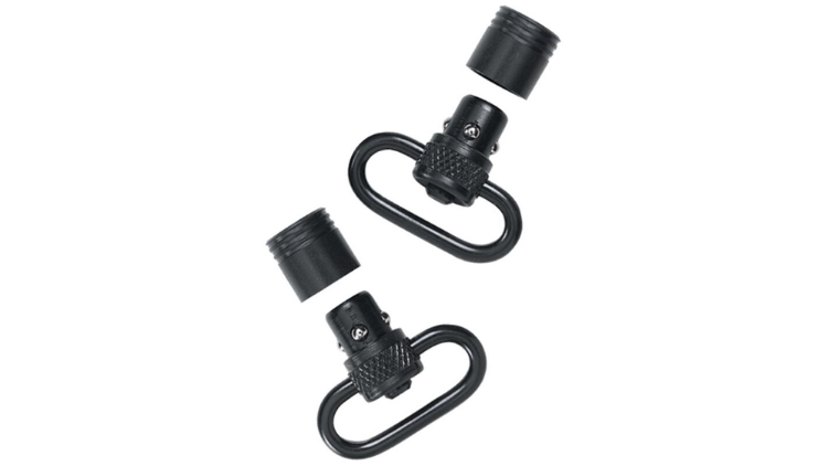 Uncle Mike’s Push Button Detachable Sling Swivels can be installed quickly. They also detach with a push of a button when needed.