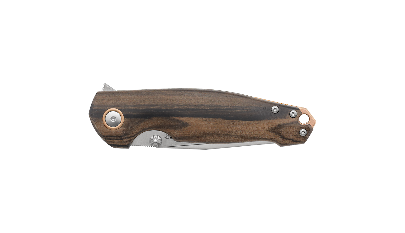 Linelock folding knife, stone washed blade, zircote wood rouded handle. Real bronze backspacer and titanium pocket clip.