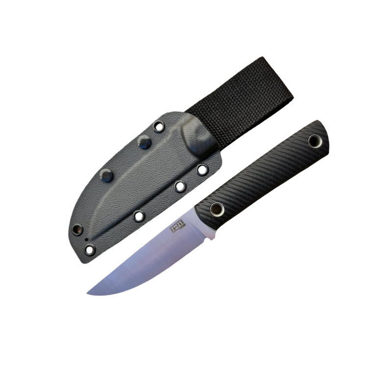 The handle linings are made of durable G10 composite or micarta. The covers adhere to the knife in a full-tang design, tightened with stainless steel sleeves. The cover material is resistant to moisture, temperature changes, most solvents and acids and, most importantly, is highly resistant to mechanical damage. Optional:Kydex sheath – can be mounted vertically to the belt with a stainless steel handle designed by us. The holes are spaced in such a way that it is possible to install a “Tek-Lok” handle.Leather sheath – made of natural cowhide in brown or black, thick and stiff, ensures a strong hold of the knife inside. Designed so that the knife hides deep inside it.